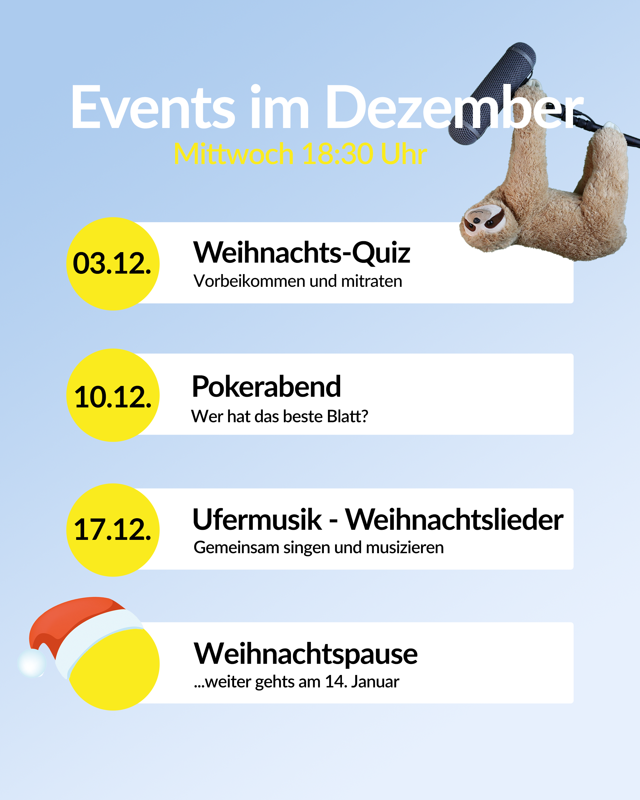 die Gemeinschaft stärken und kreativen Ideen in Esslingen einen Raum geben. Die Community-Events finden mittwochs ab 18.30 Uhr beim Landesfilmdiensts Baden-Württemberg in der Neckarstraße 53 statt. Der Besuchereingang befindet sich an der Wehrneckarstraße zwischen dem Mörike-Gymnasium und der Maille-Kreuzung. Unsere Events werden größtenteils über Spenden finanziert. Wir freuen uns auf Euch!